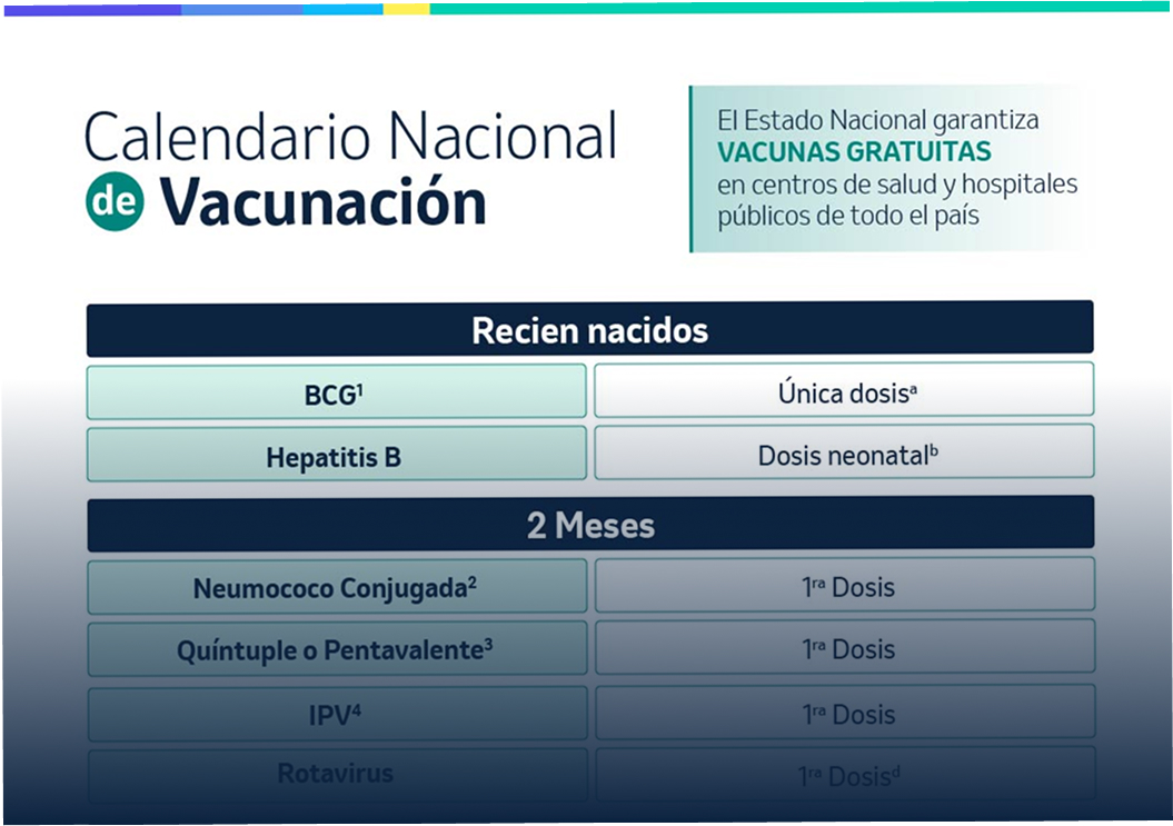 1. Calendario Nacional de Vacunación 2022. Fuente de información consultada en Junio 2022: https://bancos.salud.gob.ar/sites/default/files/2021-12/calendario-nacional-vacunacion-2022.pdf. Para más información consultar en: https://www.argentina.gob.ar/salud/vacunas